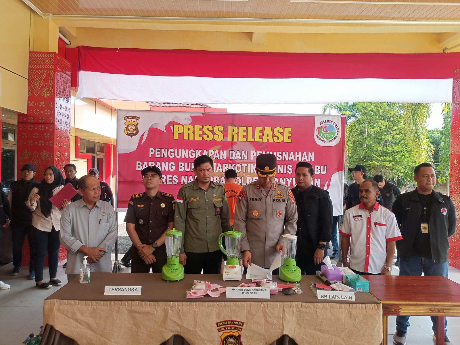 “Yang perlu digarisbawahi upaya ini dalam rangka penegakan hukum peredaran narkoba atau mengurangi peredaran narkoba di wilayah kita, dari 43 perkara yang kita ungkap ada tiga kasus perkara menonjol, 3 laporan polisi yang menonjol ini diungkap tanggal 26 Mei tanggal 30 Mei dan tanggal 2 Agustus di mana kita ketahui bersama bahwa ada tiga TKP tempat pengumpulan perkara ini, yang pertama TKP di Jalan Pangkalan Balai pengumbuk Kecamatan Banyuasin 3 kemudian di TKP taman kota Jalan Palembang Jambi Kelurahan Betung Kecamatan Betung, kemudian satu lagi di TKP rumah yang beralamat di dusun 3 Taja Mulia Kecamatan Betung,” jelasnya di dampingi Ketua BNK Banyuasin, M. Yusuf, Kejari, Kasatnarkoba, Kanit Narkoba, Tim Labfor.
