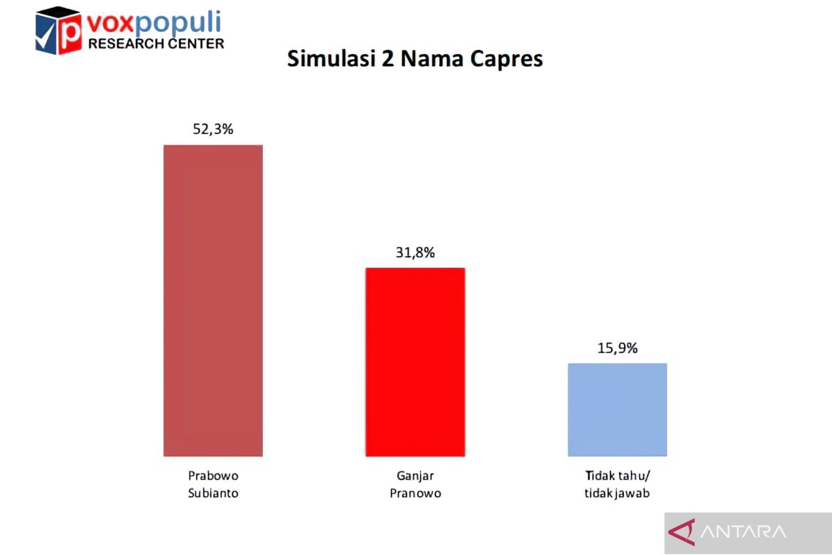 Dalam simulasi tersebut Prabowo meraup lebih dari separuh dukungan publik dengan elektabilitas mencapai 52,3 persen, sedangkan Ganjar hanya 31,8 persen, dan sisanya 15,9 persen tidak tahu/tidak jawab.
