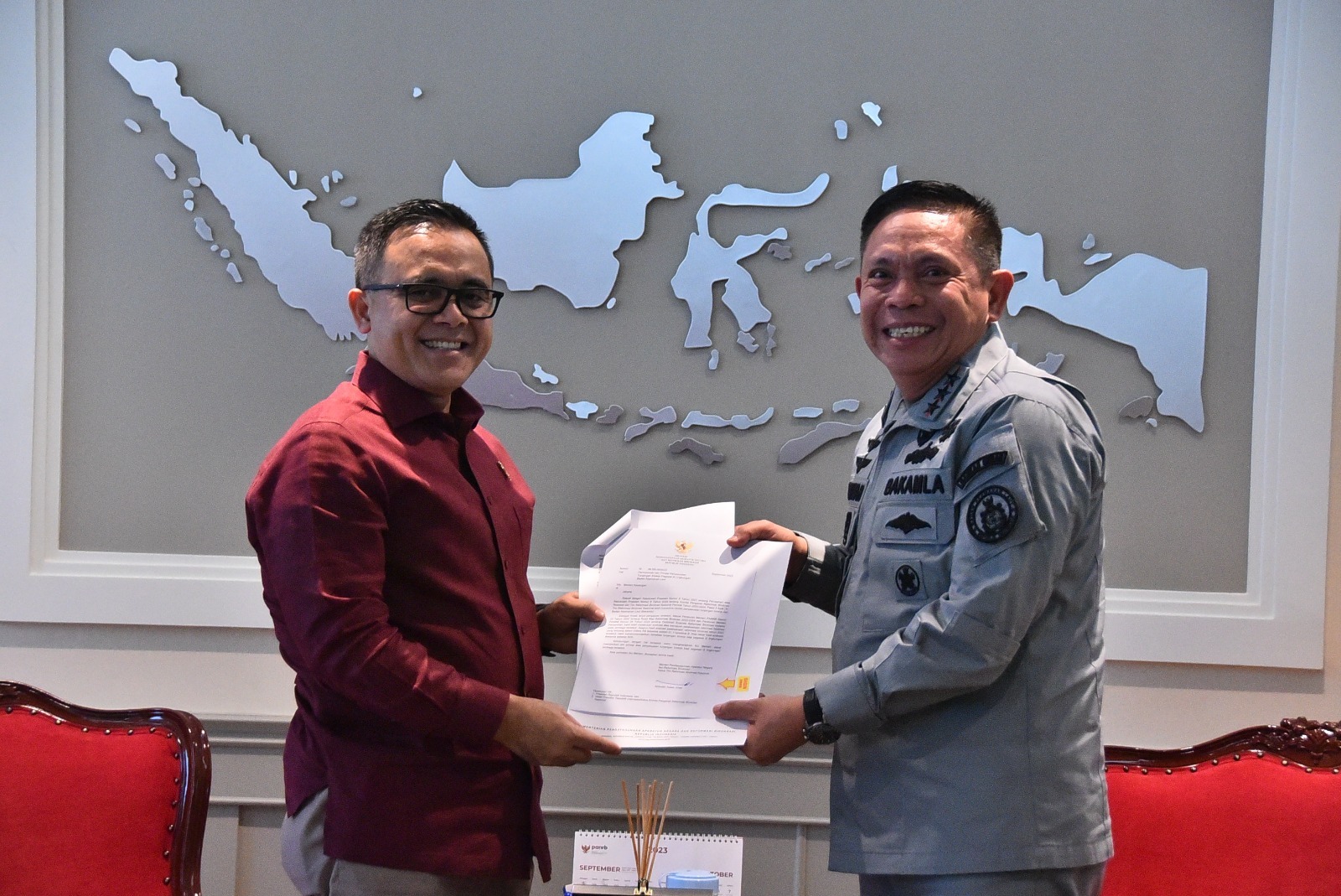 Kepala Bakamla RI Laksdya TNI Dr. Irvansyah, S.H., menerima Surat Izin Prinsip Penyesuaian Tunjangan Kinerja Pegawai di Lingkungan Badan Keamanan Laut dari Menteri PANRB Abdullah Azwar Anas di Kantor Kementerian PANRB, Jakarta, Rabu (20/9/2023).