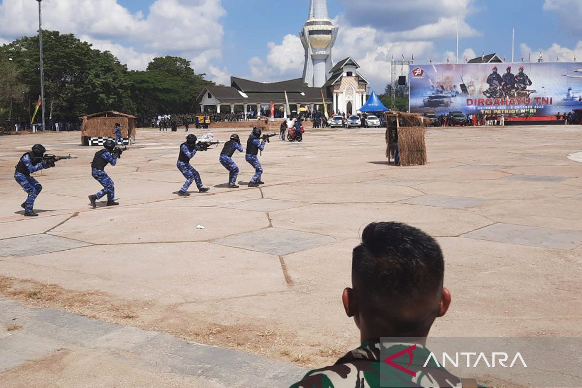Krsumsel.com – Rangkaian peringatan Hari Ulang Tahun (HUT) ke-78 Tentara Nasional Indonesia 2023 di Kendari Sulawesi Tenggara, Kamis (5/10) ditandai dengan simulasi pembebasan sandera tawanan teroris dari personil TNI AL, TNI AD, dan TNI AU.