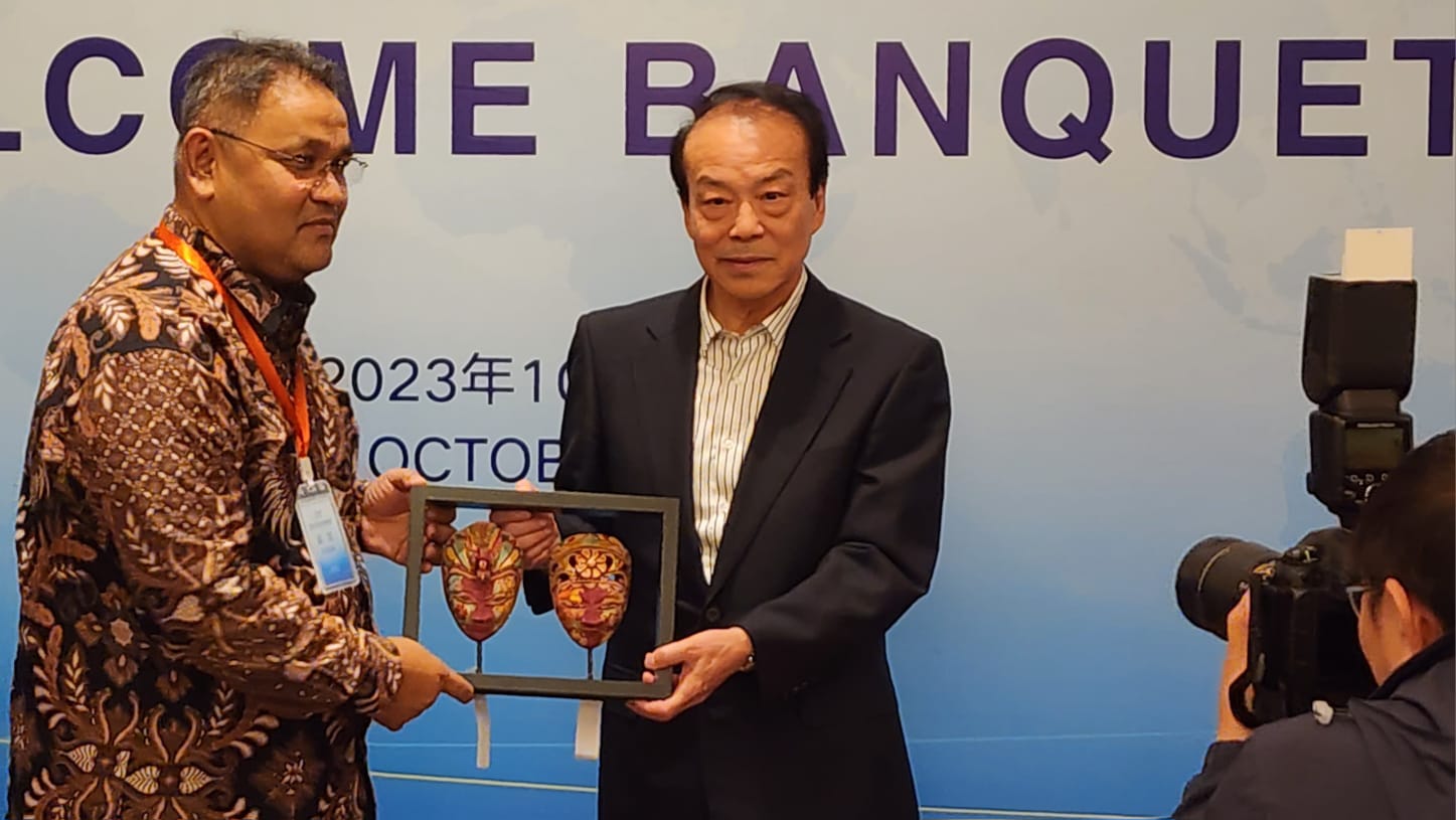 Di sela pembicaraan, Teguh menyerahkan buah tangan berupa sepasang topeng kayu bermotif batik kepada He Ping yang menerimanya dengan gembira.