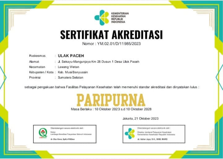 Muba, KRSUMSEL.COM – Unit Pelaksana Teknis (UPT) Puskesmas Ulak Paceh Kabupaten Musi Banyuasin (Muba) mendapatkan Akreditasi Tingkat Paripurna dari Kementerian Kesehatan Republik Indonesia (Kemenkes RI). Akreditasi ini berlaku mulai 10 Oktober 2023 hingga 10 Oktober 2028.