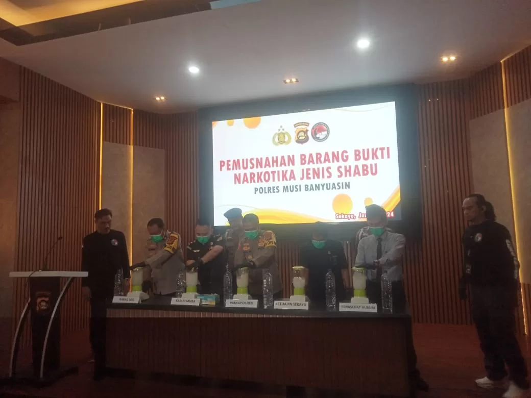 KRSUMSEL.COM, Muba – Polres Musi Banyuasin (Muba) melakukan pemusnahan barang bukti narkoba jenis sabu sebanyak 1.976, 31 gram. Pemusnahan sabu itu dilakukan dengan cara di blender, lalu dicampur air detergen dan dibuang ke kloset.