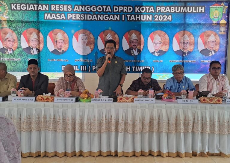 KRSUMSEL.COM, Jurnalsumatra.com – Ketua DPRD Kota Prabumulih Sutarno SE MIKom memimpin kegiatan Reses anggota DPRD masa persidangan 1 tahun 2024 di aula kantor Camat Prabumulih Timur Rabu (24/04/24).