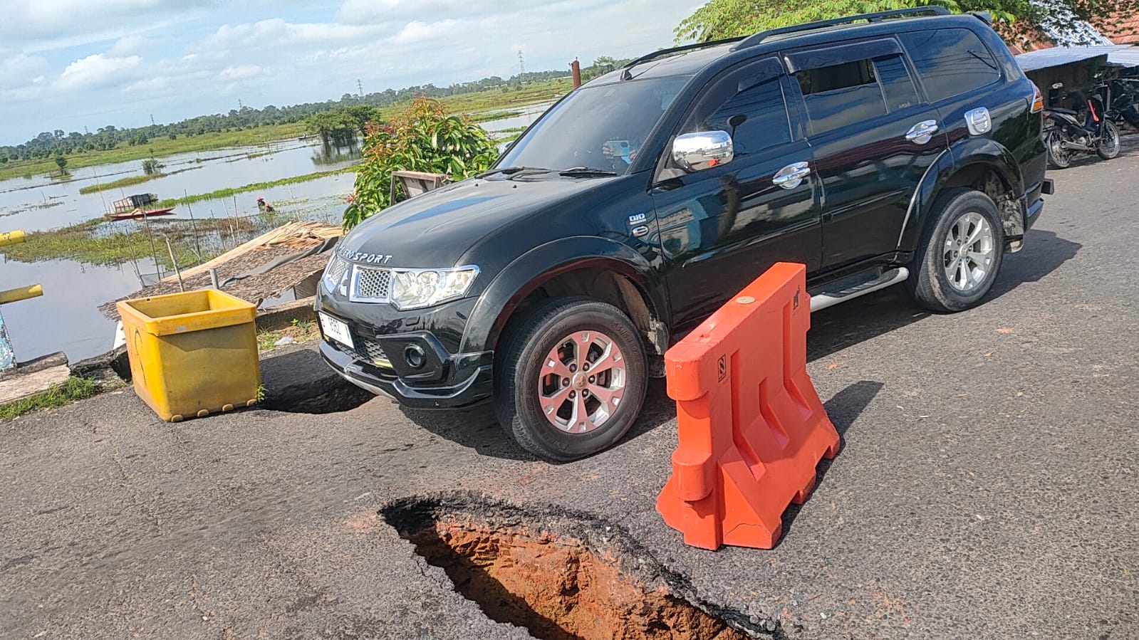 “Kami membantu mengatur kendaraan, karena tidak bisa sekaligus melintasi jalan yang jebol ini, kalau tidak begitu khawatir ambruk,” ujar Adi.