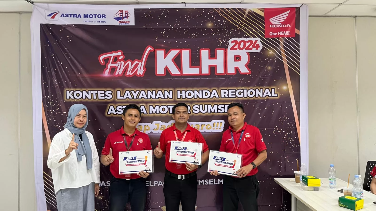 KRSumsel.com, Palembang – Astra Motor Sumsel akhirnya umumkan pemenang Kontes Layanan Honda Regional (KLHR) Sumatera Selatan 2024 yang telah diadakan di main dealer. Kompetisi ini dibagi menjadi 6 kategori yaitu Front Line People (FLP) Reguler, Customer Retention Officer, Pimpinan Jaringan Wing, Pimpinan Jaringan Reguler, Deliveryman Wing, dan Deliveryman Reguler.