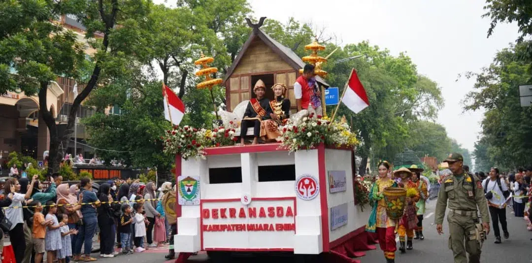 Muara Enim, KRSumsel.com – Bertemakan Rumah Tengkiang, Kujur dan Ambung kreasi Dewan Kerajinan Nasional Daerah (Dekranasda) Kabupaten Muara Enim turut meriahkan acara kirab budaya kendaraan hias pada rangkaian acara peringatan Hari Ulang Tahun (HUT) ke-44 Dewan Kerajinan Nasional (Dekranas) di Kota Surakarta, Provinsi Jawa Tengah, Jumat (17/5/2024).