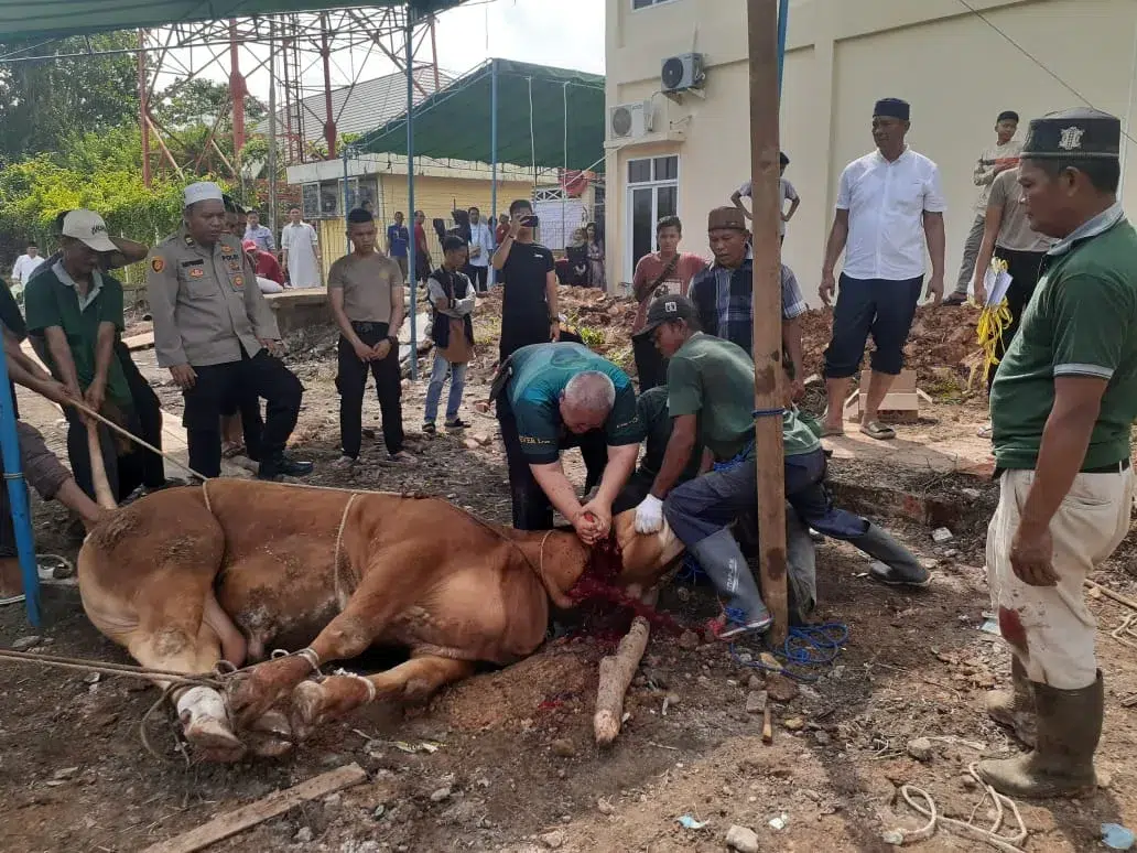 Acara pun dipimpin langsung oleh Kapolres Muba AKBP Imam Syafii dihadiri Pejabat Utama Polres Muba, para Kapolsek dan ratusan personil. Dimana kegiatan penyembelihan hewan kurban berupa sapi dan kambing berjalan aman dan lancar.