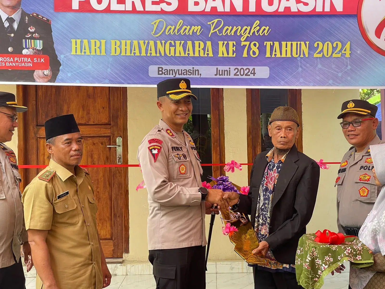 BANYUASIN, KRSumsel.com – Meresmikan bedah rumah dan sekaligus menggelar bakti sosial (Baksos) di Dusun VI Desa Bentayan Kecamatan Tungkal Ilir Kabupaten Banyuasin. Kegiatan bedah rumah dan baksos tersebut dalam rangka HUT Bhayangkara Ke-78.