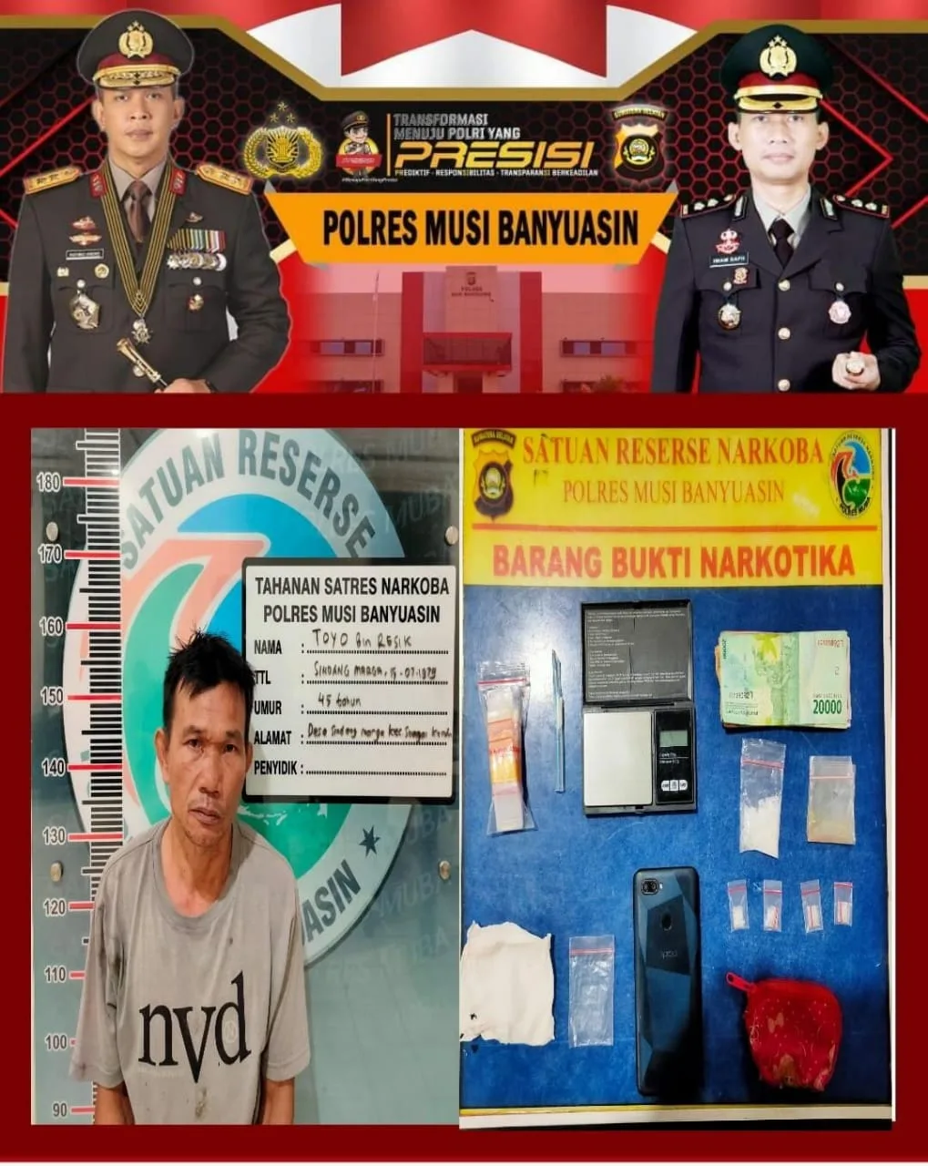 KRSUMSEL.COM, Muba – TO (45) seorang buruh tani asal Desa Sindang Marga, Kecamatan Sungai Keruh, Kabupaten Musi Banyuasin (Muba) berujung bui. Usai dirinya diciduk personil Sat Res Narkoba Polres Muba, atas ulahnya mengedarkan narkoba jenis sabu-sabu.
