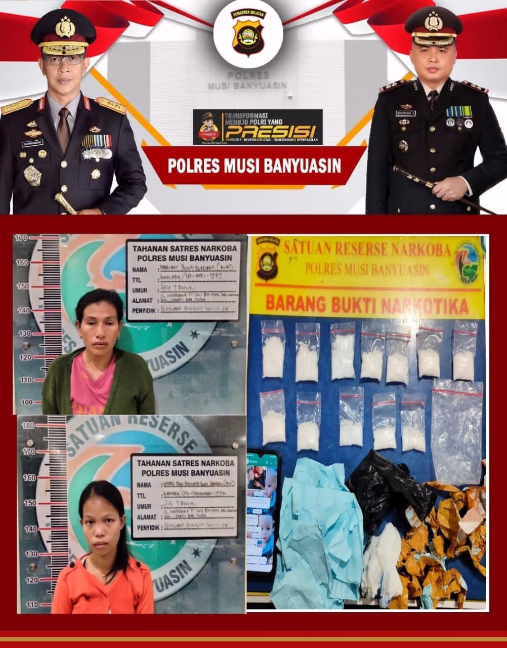 KRSUMSEL.COM, Muba – Personil Sat Res Narkoba Polres Musi Banyuasin (Muba) berhasil menangkap dua orang pengedar narkoba jenis sabu – sabu berinisial IDP (26) dan MA (44). Keduanya yang merupakan Ibu Rumah Tangga (IRT) ini ditangkap pada sebuah kontrakan di jalan Merdeka RT 003, RW 002, Kelurahan Kayuara, Kecamatan Sekayu, Kabupaten Muba pada, Rabu (10/7).