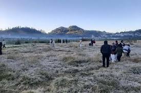 KRSumsel.com – Fenomena embun beku (embun es) atau yang dikenal dengan embun upas kembali menyelimuti wilayah di sekitar kompleks Candi Arjuna Kawasan Wisata Dataran Tinggi (KWDT) Dieng Kabupaten Banjarnegara Jawa Tengah dalam tiga hari terakhir.