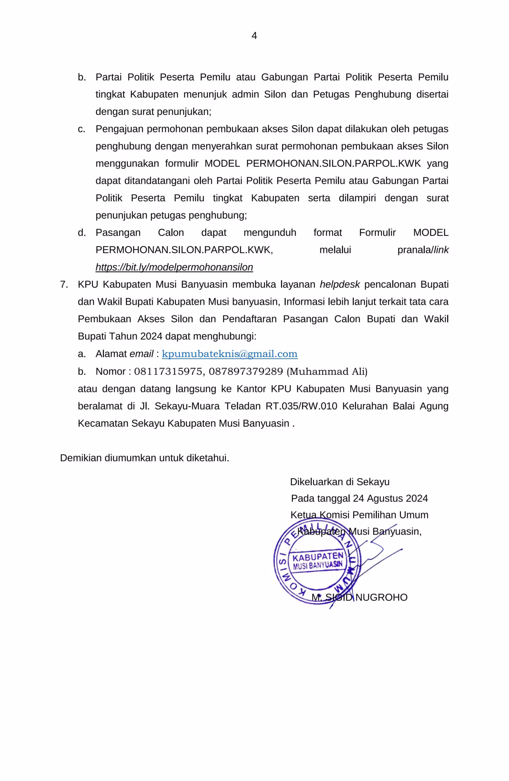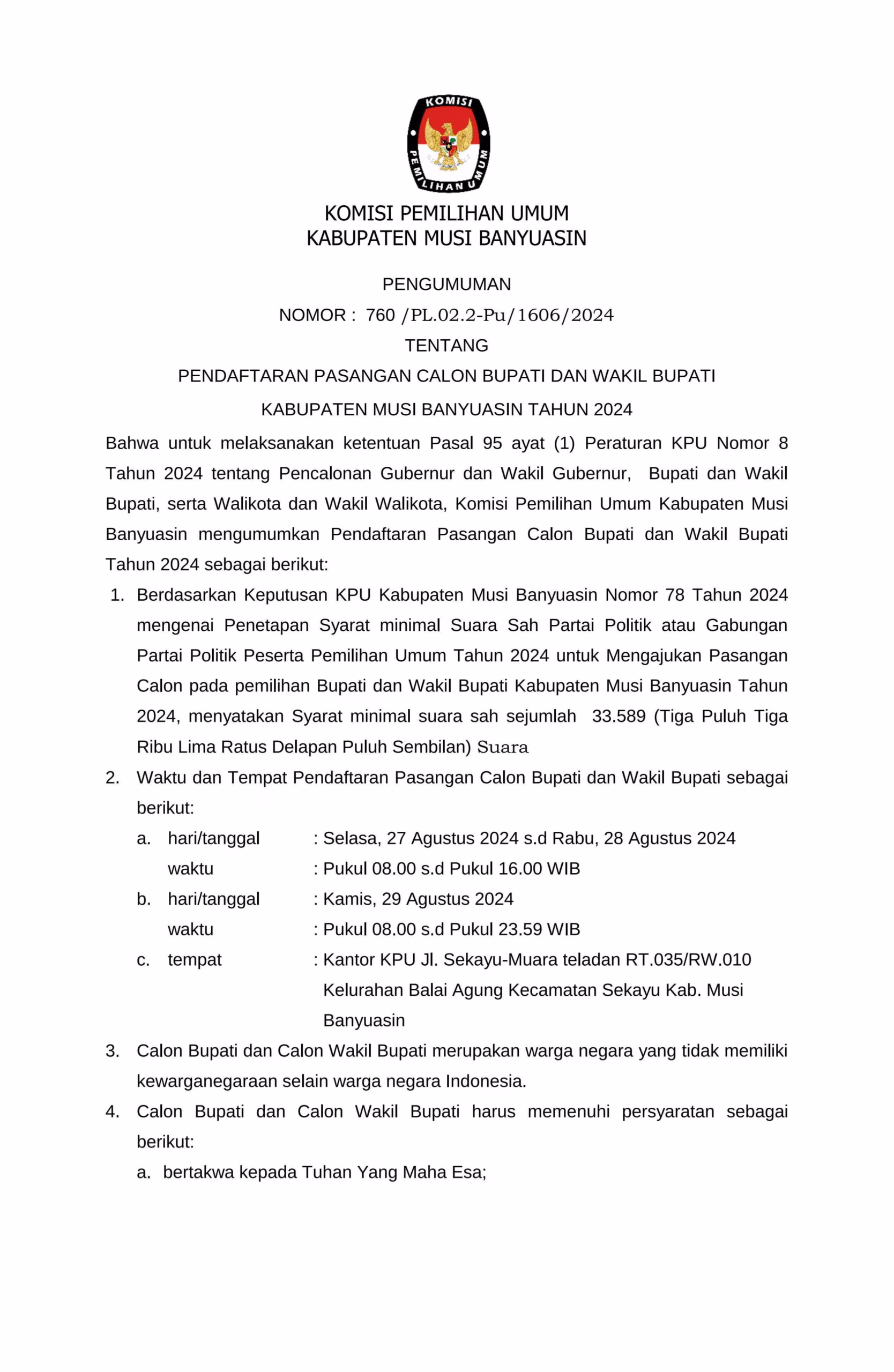 Pilkada MubaPengumuman Pendaftaran Paslon Bupati dan Wakil Bupati Muba 2024Minggu, 25 Agustus 2024, 11:41Minggu, 25 Agustus 2024, 11:48oleh Editor KRSUMSEL.COM : ataoleh Editor KRSUMSEL.COM : ata Pengumuman_Pendaftaran_Pasangan_Calon BUPATI MUBA FIXJangan LewatkanRudapaksa Anak 7 Tahun, IR Ditangkap Sat Reskrim Polres Muba15 Menit Dua Bersaudara Pengedar Ganja Diringkus, Strategi Undercover Buy Berbuah HasilNunggak, 600 Pelanggan PDAM Tirta Agung OKI DiputusAmpera Tourism Run 2026: Berlari Menembus Jantung Wisata Palembang!Pinjamkan Uang Rp 90 Juta Tak Kunjung Dibayar, Anang Jadi Korban Penipuan Bocah 11 Tahun yang Hanyut di Sungai Rawas Belum Ditemukan Gaspol Infrastruktur dan Energi Hijau, Bupati Askolani Bahas Pelabuhan Tanjung Carat dan Bio Avtur di KemenhubHj Linda Arlan Lantik Ketua TP-PKK dan Bunda PAUD Se-Kecamatan CambaiWujudkan Kota Layak Huni, Pemkot Prabumulih Perkuat Sinergi Pengelolaan Sampah dan Mutu UdaraBupati OI Sambut Kunjungan Kerja Pangdam II/Sriwijaya
