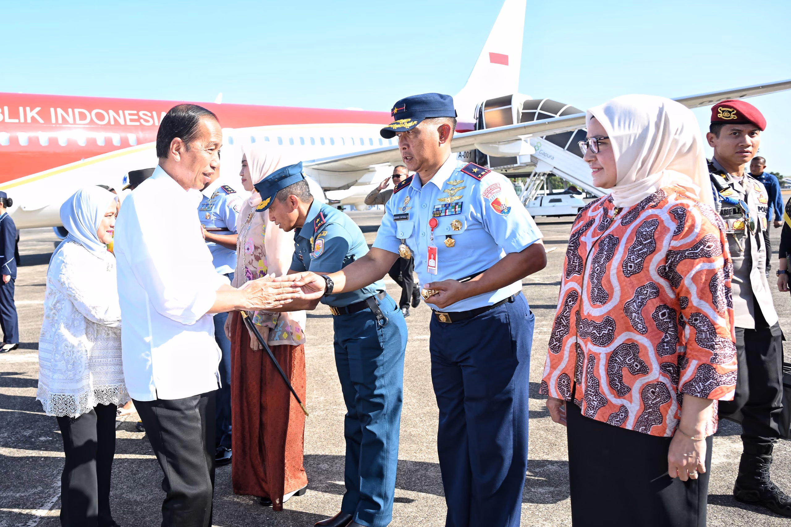 KRsumsel.com, Makassar – Komandan Lanud (Danlanud) Sultan Hasanuddin, Marsma TNI Bonang Bayuaji G., S.E., M.M., CHRMP., didampingi Ketua PIA Ardhya Garini Cabang 7/D.ll Lanud Sultan Hasanuddin Ny. Liska Bonang Bayuaji, menyambut kedatangan Presiden Republik Indonesia, Joko Widodo dan Ibu Iriana Joko Widodo di Baseops Lanud Sultan Hasanuddin, Makassar, Jumat (6/9/2024).