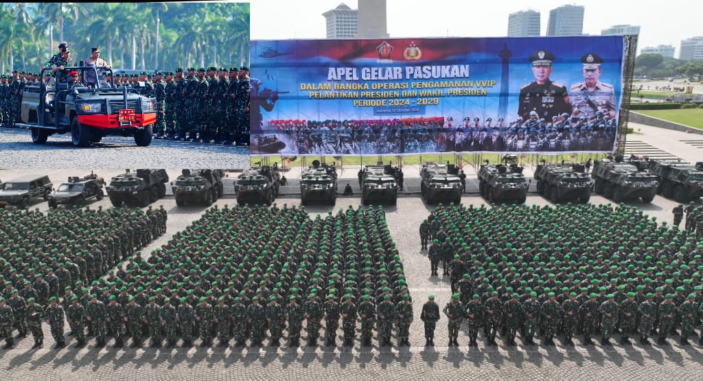 Pasukan gabungan dalam apel tersebut dari TNI Angkatan Darat, TNI Angkatan Laut, TNI Angkatan Udara, dan POLRI serta Pol PP bersiap untuk mengamankan rangkaian acara pelantikan Presiden dan Wakil Presiden RI pada 20 Oktober 2024.