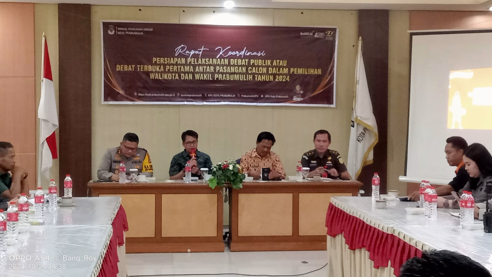 PRABUMULIH,KRSUMSEL.COM -Menjelang Debat Paslon walikota dan wakil Walikota kota Prabumulih KPU Kota Prabumulih selenggarakan Rapat Kordinasi Persiapan Pelaksanaan debat Publik/debat Terbuka Pertama antara Pasangan Calon Kota Prabumulih 2024.dihotel Grand Nikita,Kamis (24/10/24).