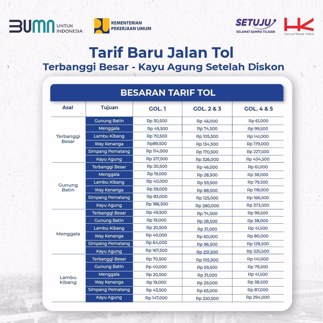 Adapun berikut besaran tarif baru dan setelah diskon tarif 15 persen di Jalan Tol Terbanggi Besar – Kayu Agung: