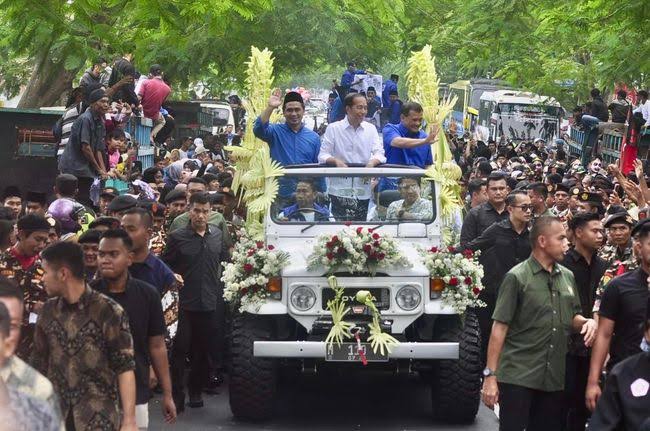 Sepanjang perjalanan, Jokowi tampak membagi-bagikan kaus kepada masyarakat dan sesekali menunjuk ke arah pasangan Luthfi-Yasin yang berada di belakangnya.