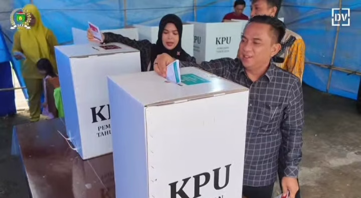 Ketua DPRD Hj. Deni Victoria mencoblos di TPS 09 di lingkungan kediamannya di komplek Villa Lingkar Mas Kelurahan Gunung Ibul, Kecamatan Prabumulih Timur. Hj. Deni Victoria tampak didampingi oleh isteri tercintanya, Hj. Leni Kartika. Keduanya tampak serasi dengan outfit berwarna hitam.