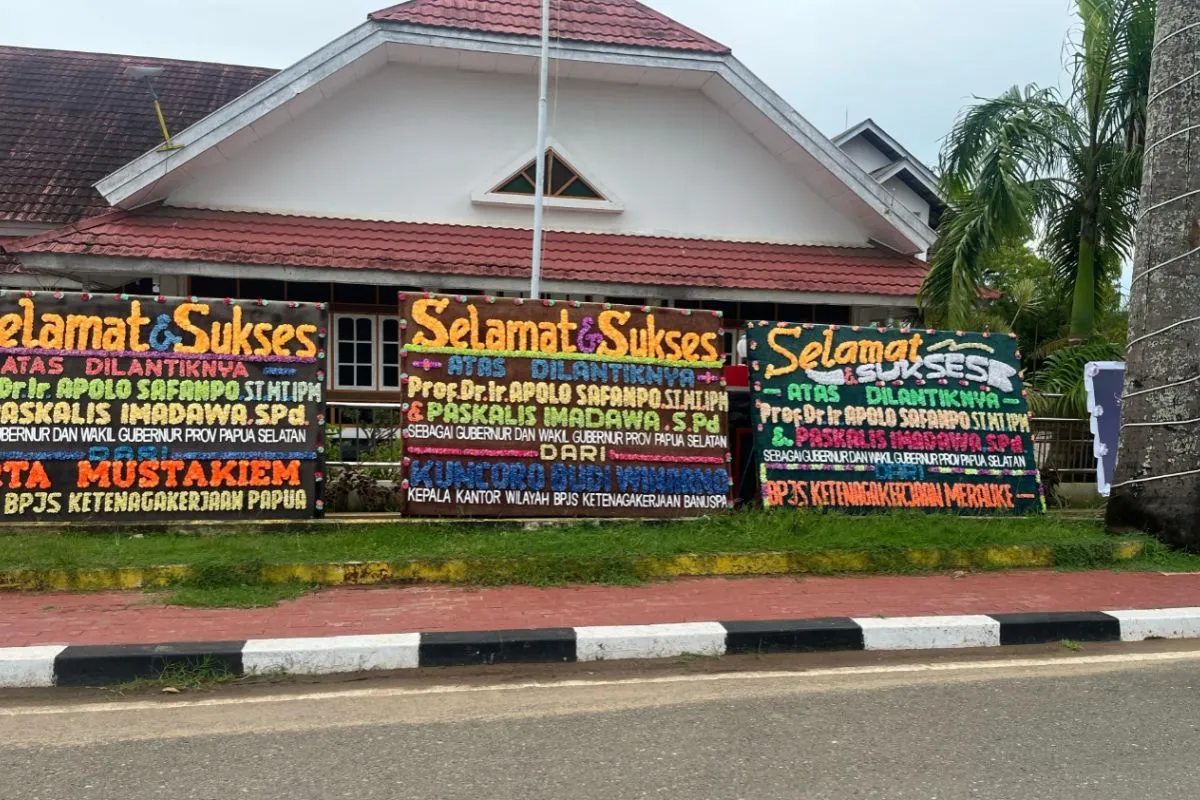 Sekadar untuk diketahui, setelah Apolo Safanpo dan Paskalis Imadawa dilantik sejumlah karangan bunga ucapan telah berjejer di sepanjang pagar Kantor Gubernur Papua Selatan.