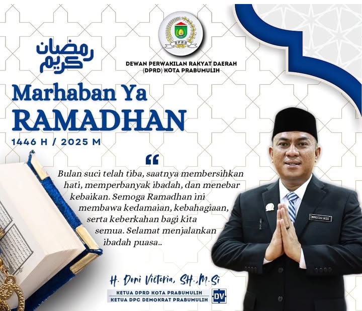 “BismillahirrahmanirrahimAssalamualaikum warahmatullahi wabarakatuh saya H. Deni Victoria. SH., M.Si.Ketua DPRD Kota PrabumulihMengucapkan – Selamat Menunaikan Ibadah Puasa Dibulan Ramadhan 1446 H, Semoga Dibulan Ramadhan ini kita semua diberikan keberkahan,”Ucapnnya.