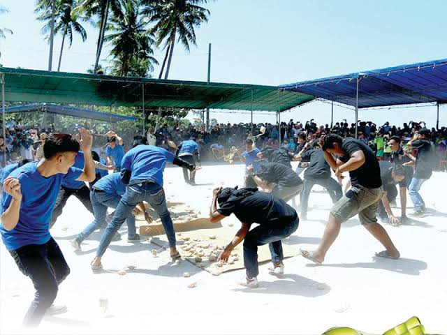 Biasanya dilakukan setiap tahunnya menjelang bulan ramadan, tradisi ini dilakukan dengan saling melempar ketupat sebagai simbol mengusir makhluk halus yang jahat.