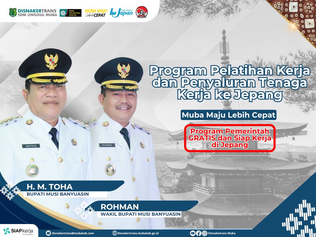 KRSUMSEL.COM, Muba – Pemerintah Kabupaten Musi Banyuasin Melalui Dinas Tenaga Kerja dan Transmigrasi (Disnakertrans) Kabupaten Musi Banyuasin (Muba) membuka kesempatan bagi lulusan SMA/SMK dan tenaga kerja muda untuk mengikuti Program Magang Kerja ke Jepang.