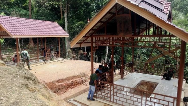 “Medannya agak sulit, terlebih saat ini cuaca musim hujan, menyebabkan akses jalan baru tidak bisa dilalui kendaraan normal untuk membawa material,”ujarnya.Pekerjaan pembangunan makam ini dilaksanakan sejak Oktober 2024.