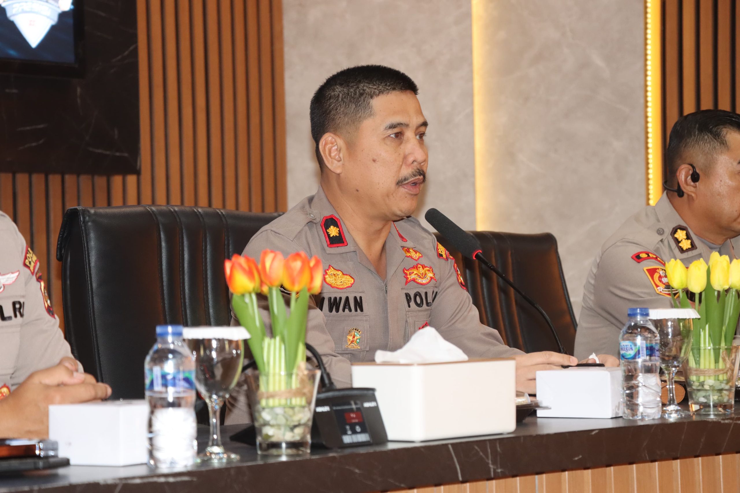 KRSUMSEL.COM, Muba – Bertempat di aula H Alex Noerdin Mapolres Musi Banyuasin (Muba), Selasa (29/4) pagi. Wakapolres Muba Kompol Iwan Wahyudi, Kabag Sumda Polres Muba Kompol Novrizal dan Kasat Lantas Polres Muba AKP Pandri Pratama Putra Simbolon menerima sebanyak 30 orang siswa Dikbangspers SPN Betung Polda Sumsel.