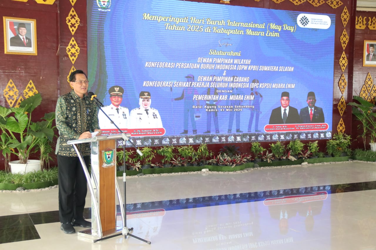 Komitmen tersebut disampaikan Bupati dalam acara Peringatan Hari Buruh Internasional (May Day) Tahun 2025 yang juga turut dihadiri oleh Wakil Bupati Muara Enim, Ir. Hj. Sumarni, M.Si., beserta Ketua TP PKK Kab. Muara Enim, Hj. Heni Pertiwi Edison, S.Pd., di Balai Agung Serasan Sekundang Muara Enim, Kamis (1/5/2025).