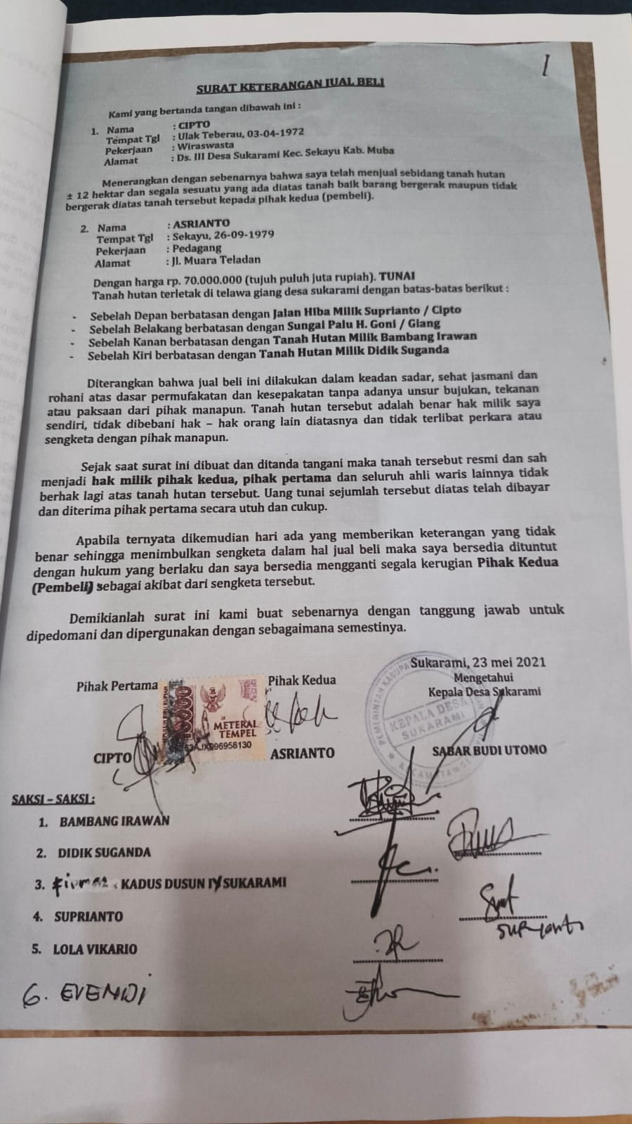 Sabar menjelaskan, sewaktu dirinya disodorkan surat keterangan jual-beli. Memang benar ada keterangan kedua belah pihak sudah sepakat untuk melakukan transaksi jual-beli. Di dalam surat tersebut, selain penjual dan pembeli juga ada saksi pemilik batas tanah (sempadan) yang juga sudah membubuhkan tanda tangan. Termasuk perangkat desa dalam hal ini Kepala Dusun (Kadus ) yang pasti lebih paham dengan wilayahnya.