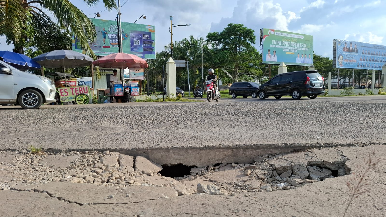 “Sudah dua tiga bulan terakhir ambles. Belum juga diperbaiki,” kata salah seorang penjual minuman dekat gerbang KPT Tanjung Senai.