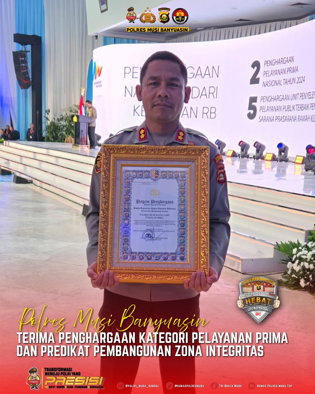 Dimana penghargaan yang diterima ini ialah penghargaan bergengsi dari Kapolri dalam Kategori Prima (A) dan Predikat Pembangunan Zona Integritas di Polres Muba.