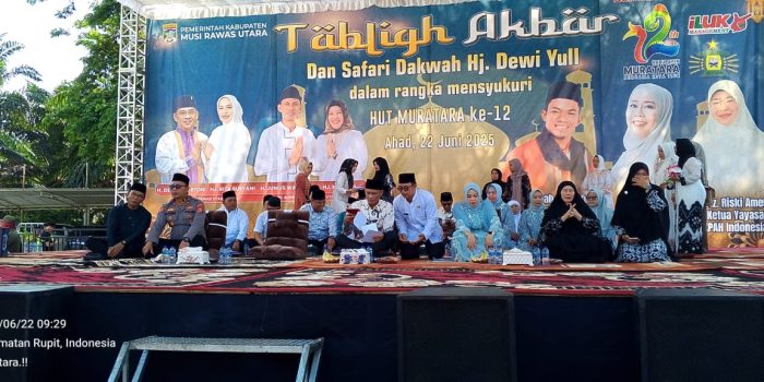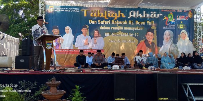 Muratara, KRSumsel.com – Menjelang puncak perayaan Hari Ulang Tahun (HUT) Kabupaten Musi Rawas Utara (Muratara) ke-12 yang jatuh pada Senin (23/6/2025), Pemerintah Kabupaten Muratara melalui Bagian Kesejahteraan Rakyat (Kesra) menggelar kegiatan Tabligh Akbar, Minggu (22/6/2025).