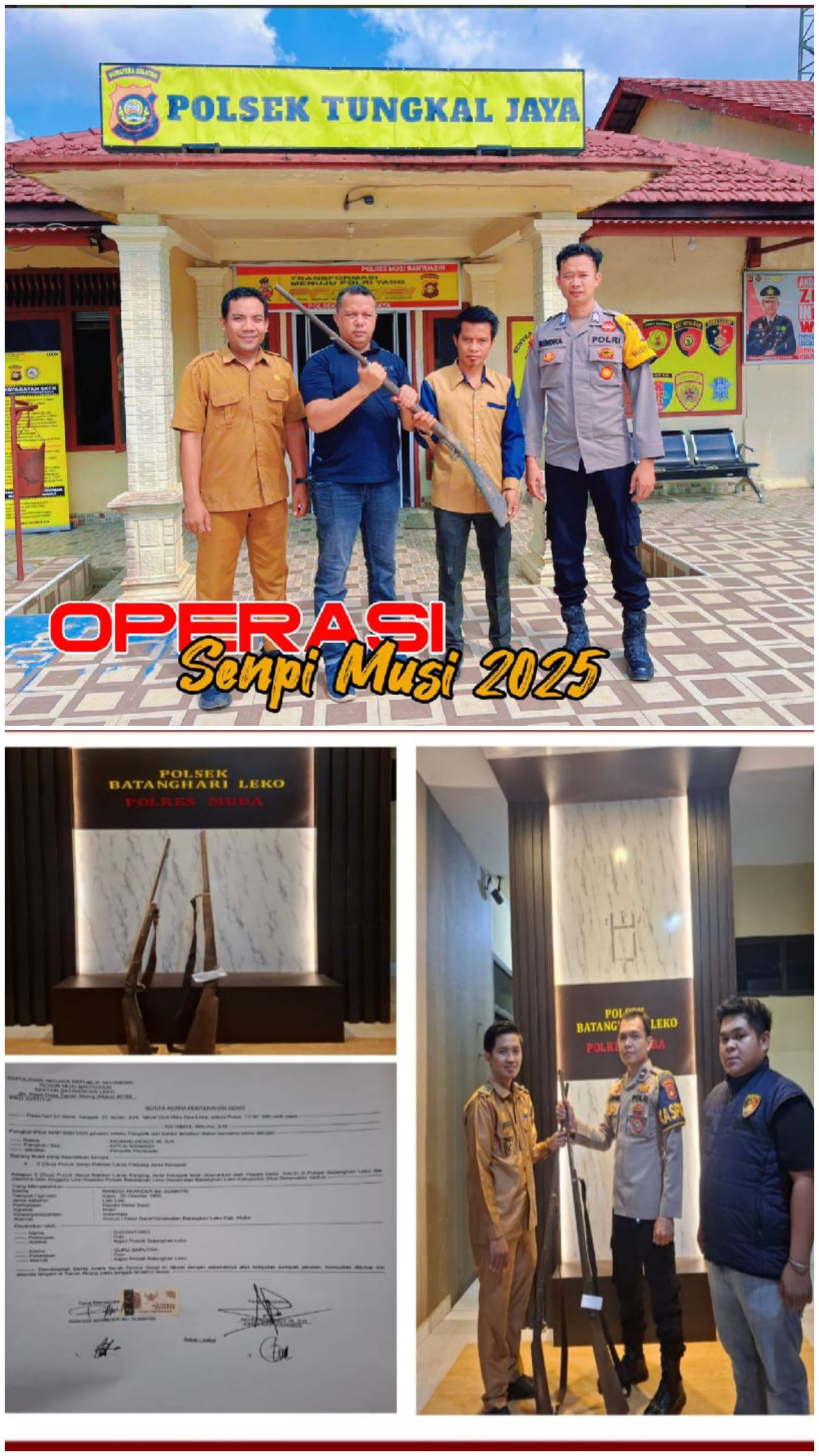 Kedua, di waktu yang hampir sama juga. Dalam wilayah hukum Polsek Batanghari Leko, Kades Saud, Kecamatan Batanghari Leko, Kabupaten Musi Banyuasin, menyerahkan secara sukarela dua pucuk senjata api rakitan laras panjang bergagang kayu berwarna coklat. Seluruh barang bukti tersebut telah diamankan di Polsek Batanghari Leko.