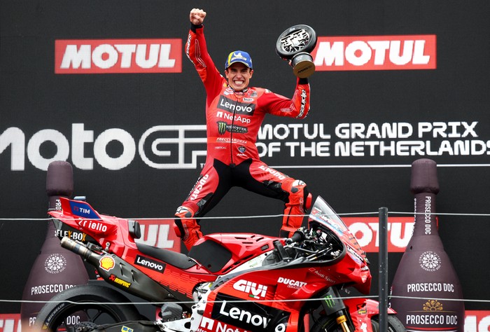 Assen, krsumsel.com – Rider Ducati Marc Marquez sukses memenangi MotoGP Belanda 2025. Marquez menyamai jumlah kemenangan legenda balap motor Giacomo Agostini di kelas premier.