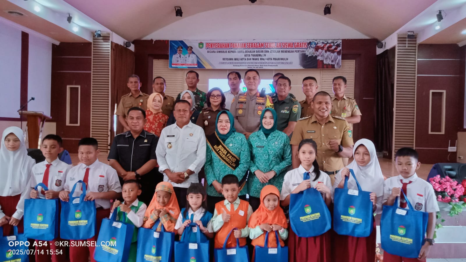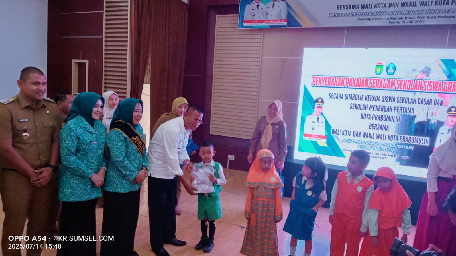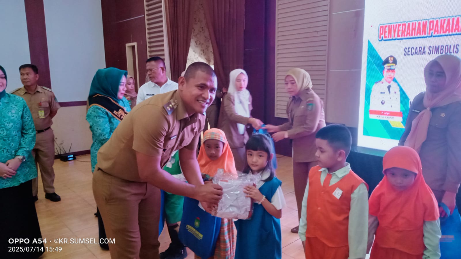 PRABUMULIH, KRSUMSEL.COM -Pembagian Seragam Sekolah di Lingkungan Dinas Pendidikan dan Kebudayaan Kota Prabumulih Tahun 2025 yang bersumberkan dari dana APBD kota Prabumulih di Gedung Kesenian Rumah Dinas Walikota Prabumulih sebagai Pelaksana DISDIKBUD yang dihadiri langsung Wako H Arlan dan Wawako Franky Nasril,Senin (14/07/25).