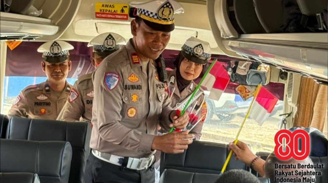AKP Suwandi menegaskan tujuan utama kegiatan ini. “Selain untuk menumbuhkan dan memupuk rasa nasionalisme serta cinta tanah air di tengah masyarakat, khususnya para pengguna jalan, dalam rangka menyambut HUT RI ke-80 yang penuh khidmat,” jelasnya,