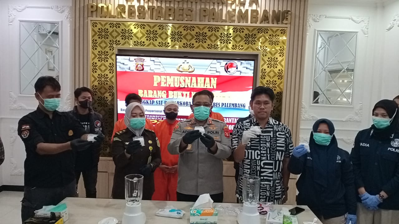 PALEMBANG, KRsumsel.com — Satres Narkoba Polrestabes Palembang melakukan pemusnahan barang bukti dengan cara diblender sabu seberat 498, 53 gram sabu, Kamis (7/8/2025), dipimpin langsung oleh Wakapolrestabes Palembang AKBP Aditya Kurniawan didampingi Kasat Narkoba Kompol Faisal Manalu.