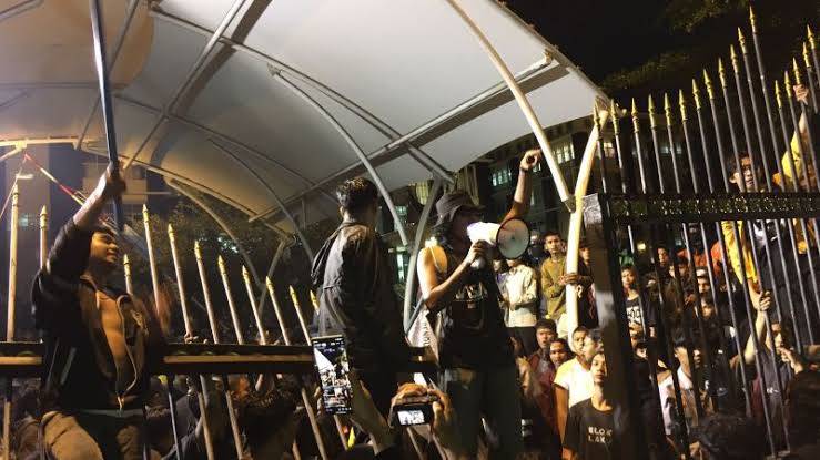 Ketegangan kian meningkat ketika massa berusaha menerobos pagar yang ditutup rapat, akibatnya pagar Mapolda Sumbar roboh karena didorong.
