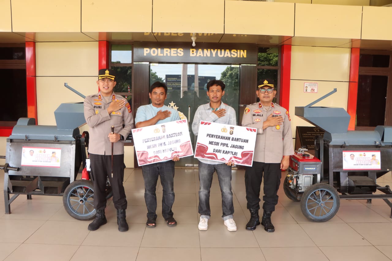 BANYUASIN,KRSumsel.com – Guna mendukung ketahanan pangan dan meningkatkan produktivitas petani, Polres Banyuasin menyalurkan bantuan mesin pemipil jagung dari Kapolri kepada dua kelompok tani di Kabupaten Banyuasin. Penyerahan bantuan ini berlangsung di Mapolres Banyuasin, Jumat (3/10/2025).