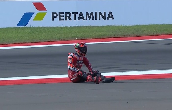 Duo Ducati apes. Marc Marquez terjatuh di awal balapan karena diseruduk Marco Bezzecchi, lalu Francesco Bagnaia alami lowside dan juga terjatuh.