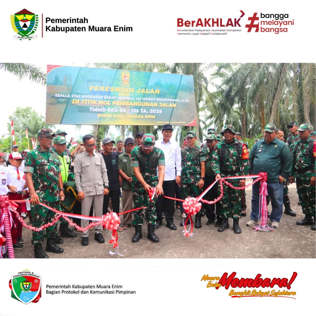 Muara Enim, KRSumsel.com – Kegiatan TNI Manunggal Membangun Desa (TMMD) Ke-126 di Kabupaten Muara Enim yang menyasar pembangunan di tiga desa, yakni Desa Saka Jaya, Desa Muara Harapan, dan Desa Harapan Jaya, Kecamatan Muara Enim secara resmi ditutup oleh Kepala Staf Angkatan Darat (KSAD) TNI AD, Jenderal Maruli Simanjuntak.