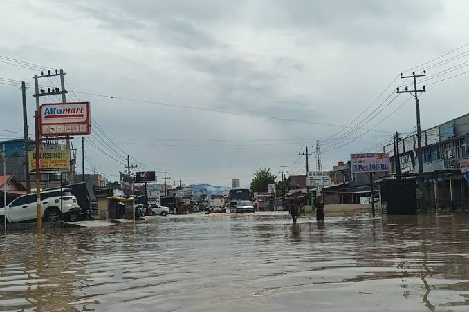 Untuk ketinggian air yang menggenangi jalan tersebut mencapai 50 centimeter sehingga kendaraan roda dua maupun roda empat tidak dapat melewati ruas jalan tersebut.