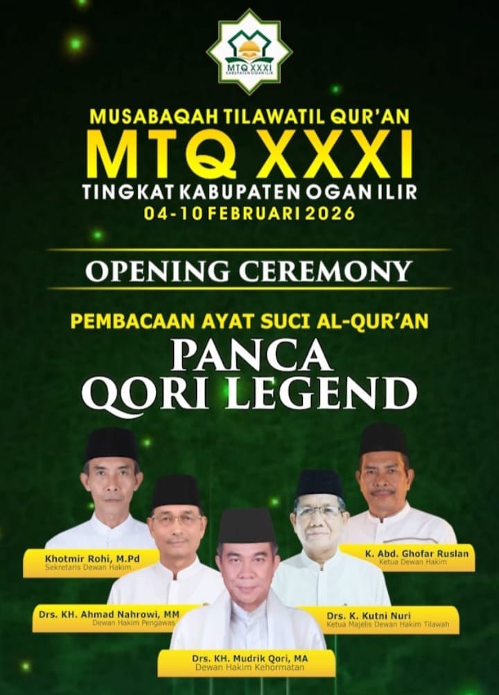 Dimana, pihak Kesra Ogan Ilir akan mempertunjukkan penampilan lima qori senior asal Kabupaten Ogan Ilir, yang disebut dengan Panca Qori Legend.