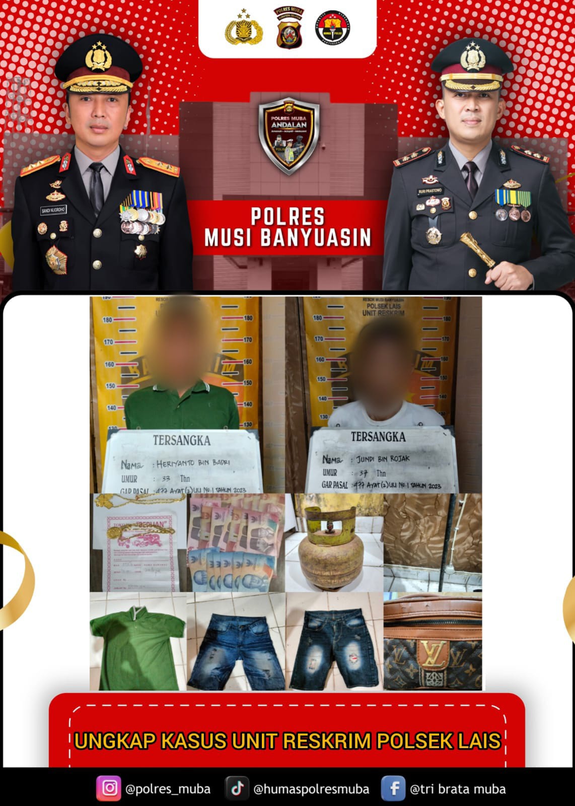 KRSUMSEL.COM, Muba – Unit Reskrim Polsek Lais Polres Musi Banyuasin (Muba) berhasil mengungkap dan meringkus dua orang pelaku dalam kasus pencurian dengan pemberatan (curat), yang terjadi di Dusun III Desa Teluk Kijing II, Kecamatan Lais, Kabupaten Muba.