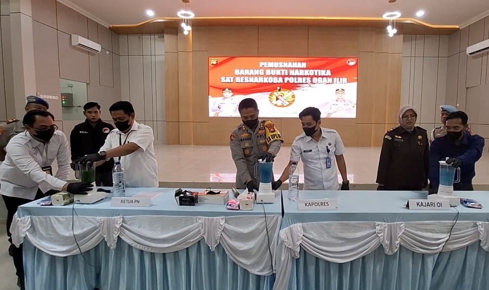 “Barang bukti dua macam narkoba ini dimusnahkan dengan cara diblender dan dibuang ke saluran air,” kata Bagus di Mapolres Ogan Ilir, Rabu (18/2) petang.