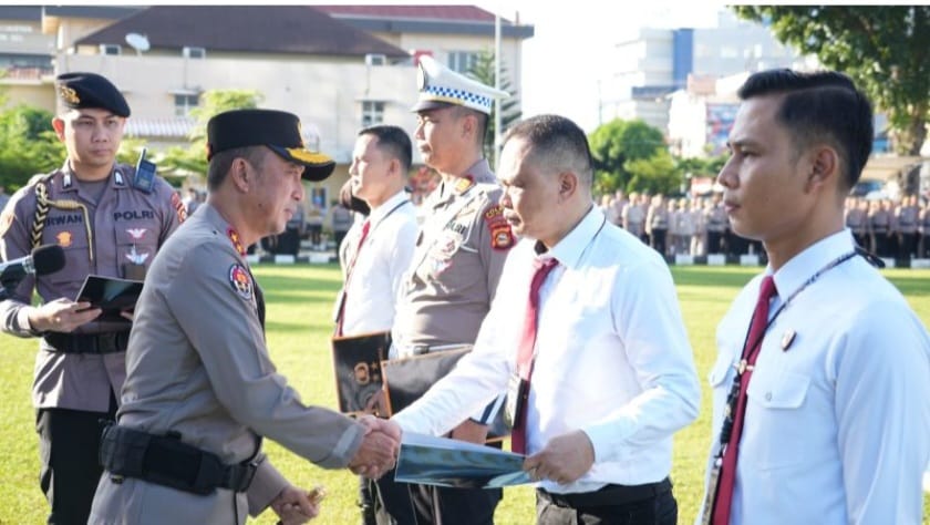 Proses pemberian penghargaan oleh Kapolda Sumsel berlangsung di Lapangan Apel Mapolda Sumatera Selatan (Sumsel). Diterima langsung oleh Kanit Ranmor Polrestabes Palembang, Iptu Jhony Palapa, Kasubnit Ranmor Polrestabes Palembang, Ipda M Gadik Pratama.