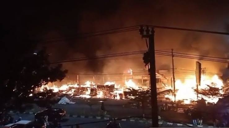 Bungo, krsumsel.com – Kebakaran hebat melanda pasar di Kabupaten Bungo Provinsi Jambi pada Minggu (26/4) dini hari yang menyebabkan 120 pedagang terdampak karena lapak mereka hangus dilahap api.
