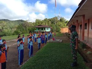 Pupuk Jiwa Nasionalisme Anak-Anak Perbatasan Satgas Pamtas RI-MLY Yonif Raider 200/BN Ajarkan Lagu Indonesia Raya